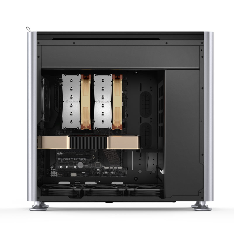 通过底部的240/280/360风扇组合,提供充足的冷气流进气量,经过显卡以及内部的发热硬件后,最终由顶部的240/280/360风扇或水冷排导出,构成通透的垂直风流散热。相比常规前置外露的风扇位,上下内藏式的风扇设计也能阻隔主机工作时发出的部分噪音。