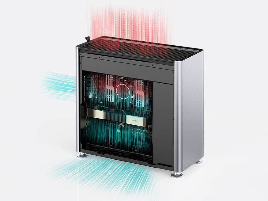 通过底部的240/280/360风扇组合,提供充足的冷气流进气量,经过显卡以及内部的发热硬件后,最终由顶部的240/280/360风扇或水冷排导出,构成通透的垂直风流散热。相比常规前置外露的风扇位,上下内藏式的风扇设计也能阻隔主机工作时发出的部分噪音。